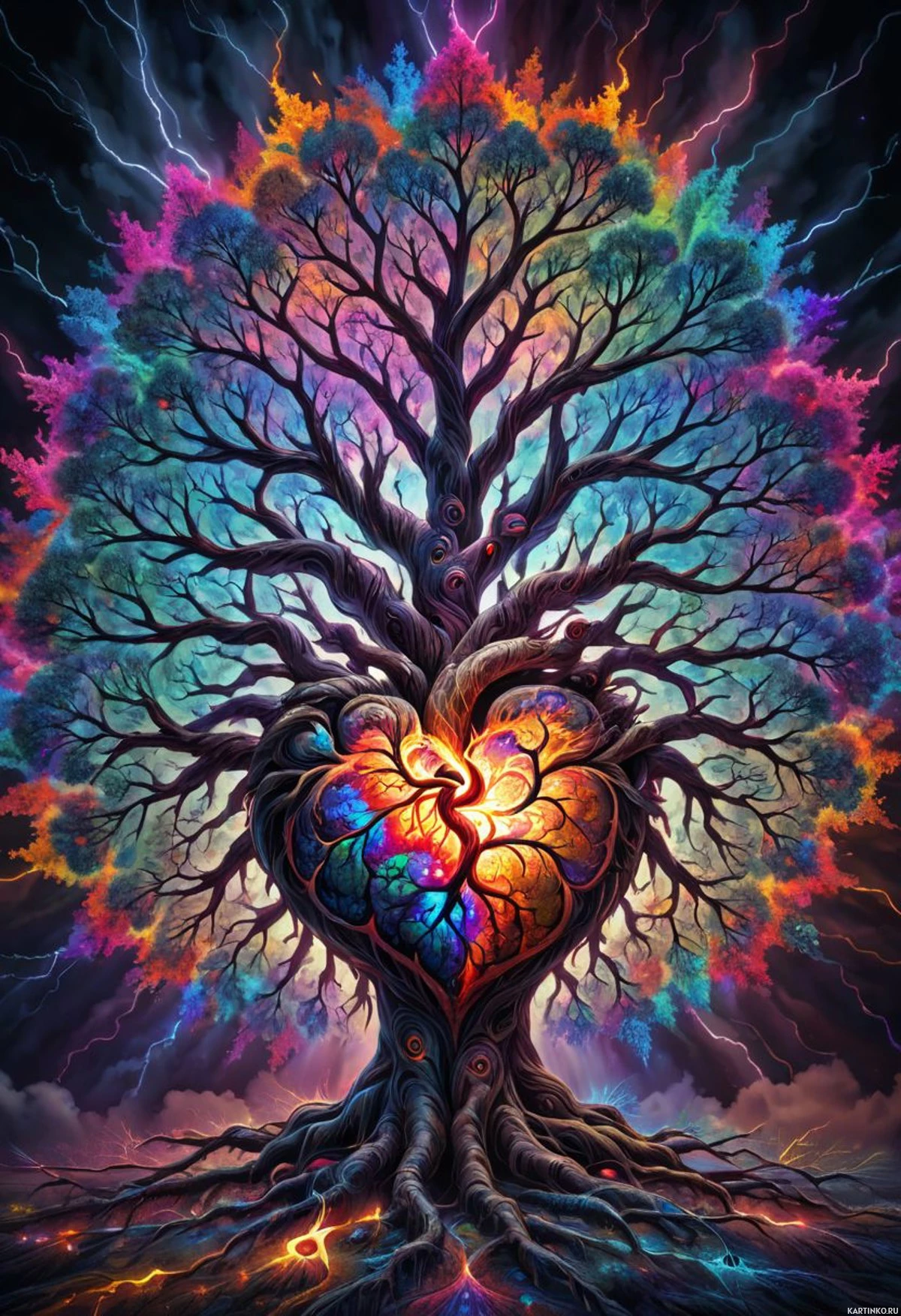На картинке изобращено сказочное дерево, в стволе которого вписаны три больших сердца. Каждое сердце наполнено разноцветной жидкостью, символизирующей разные эмоции, например, любовь, гнев и грусть или радость. Вокруг дерева простирается нереальный пейзаж с камнями и едва заметным светом на заднем плане. Вся сцена словно из сновидения.