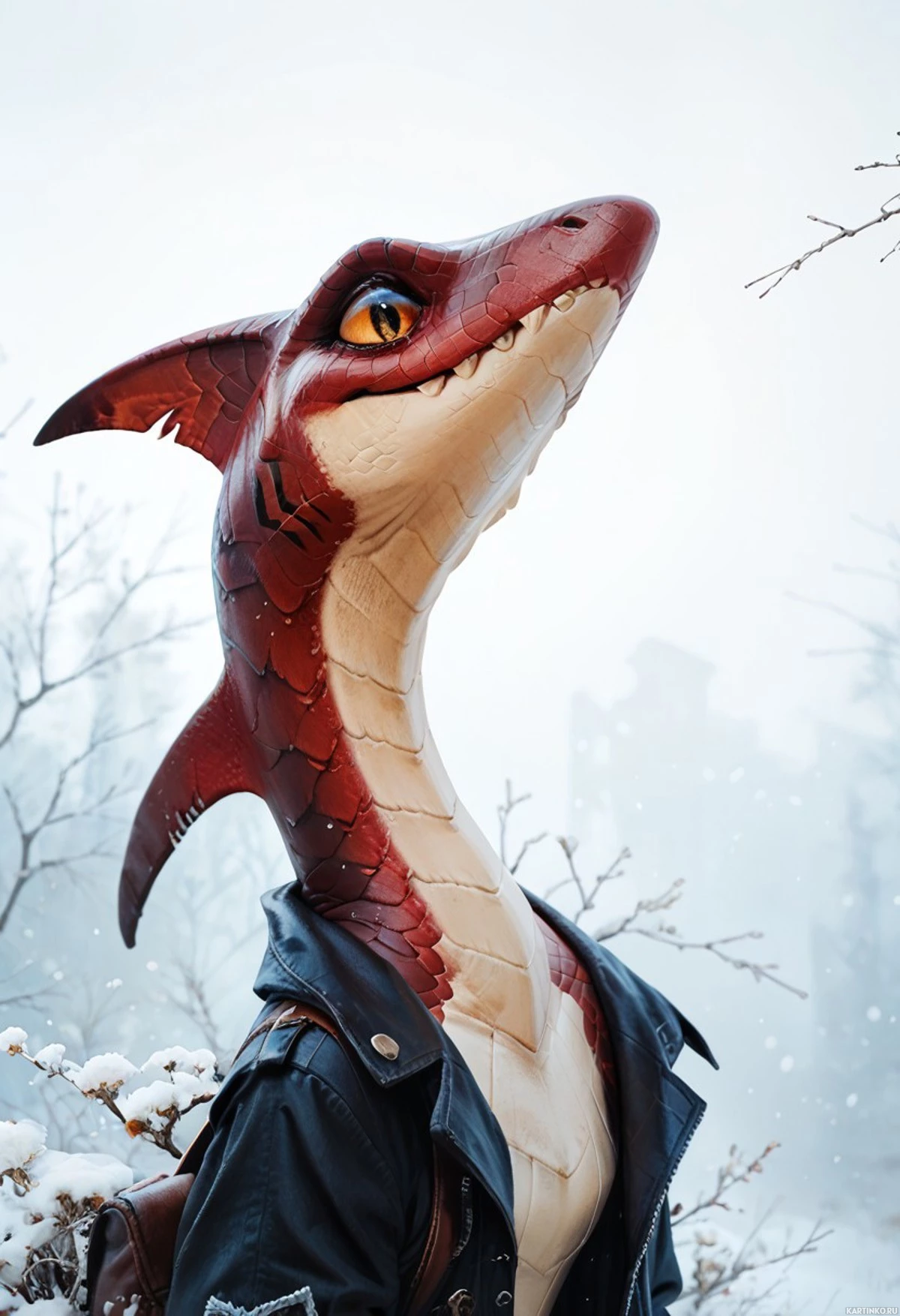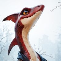 a unique headpiece that resembles a dragon or lizard-like creature. This headpiece has red scales,