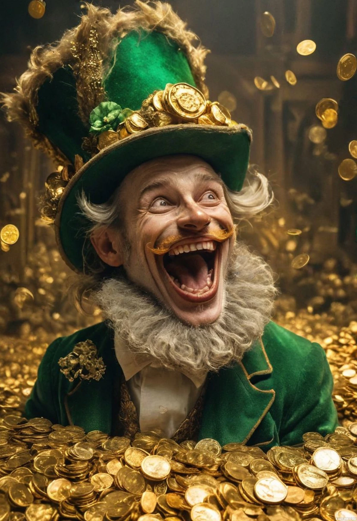 green attire with gold embellishments, and they have a long beard and mustache that suggest an older or seasoned appearance. They are laughing heartily, which contributes to the image's overall joyful and whimsical atmosphere. The background appears to be a room made of stone or brick, possibly a treasure chamber given the abundance of