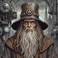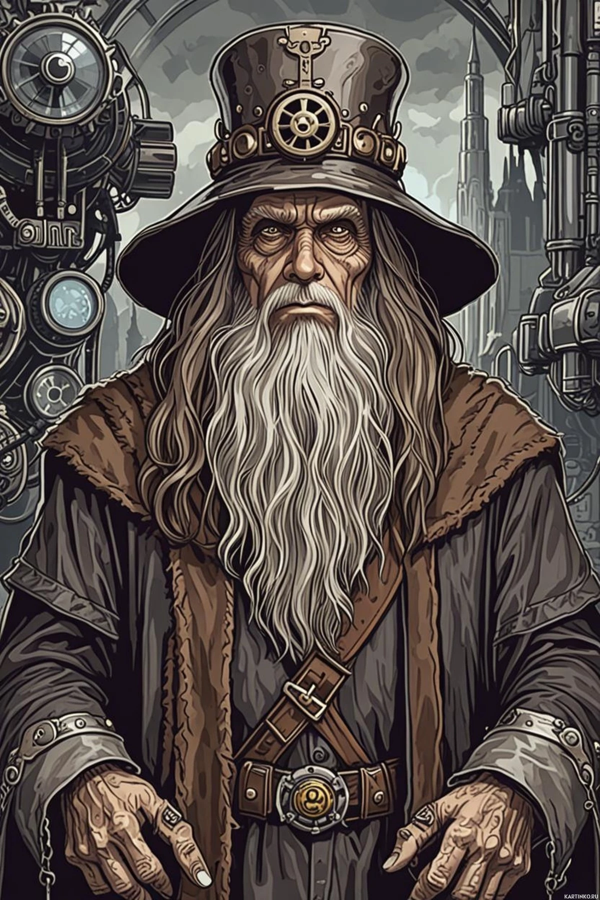 a long beard and mustache, and his hair is styled to hang over his shoulders. The man's left hand rests on his hip while the right hand holds what appears to be a wand or staff. His clothing includes a cloak draped over one shoulder and an elaborate hat adorned with