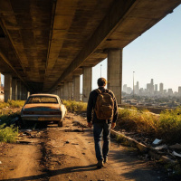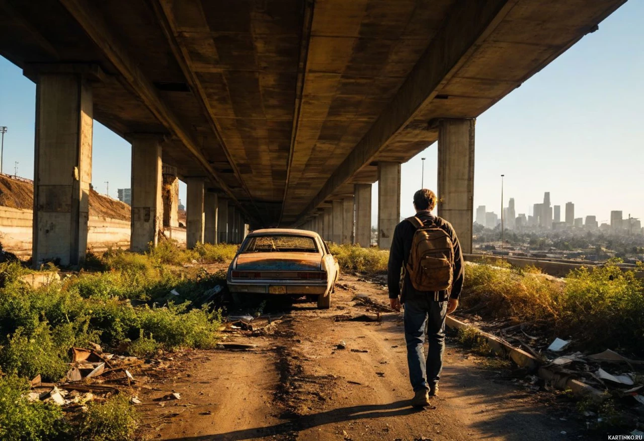 In this image, there is a man walking on what appears to be an abandoned road or bridge. The road has visible cracks and weeds growing through the concrete. He is dressed casually in jeans and a t-shirt, with a backpack slung over his shoulders, suggesting he might be traveling or exploring. Above him, there are concrete supports for a highway or overpass that have been constructed but not completed. In the background, beyond the man and the unfinished highway, one can see