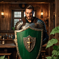 historical armor. He is wearing a green breastplate with a cross design on it, and his attire suggests that he could be portraying a warrior or a knight from