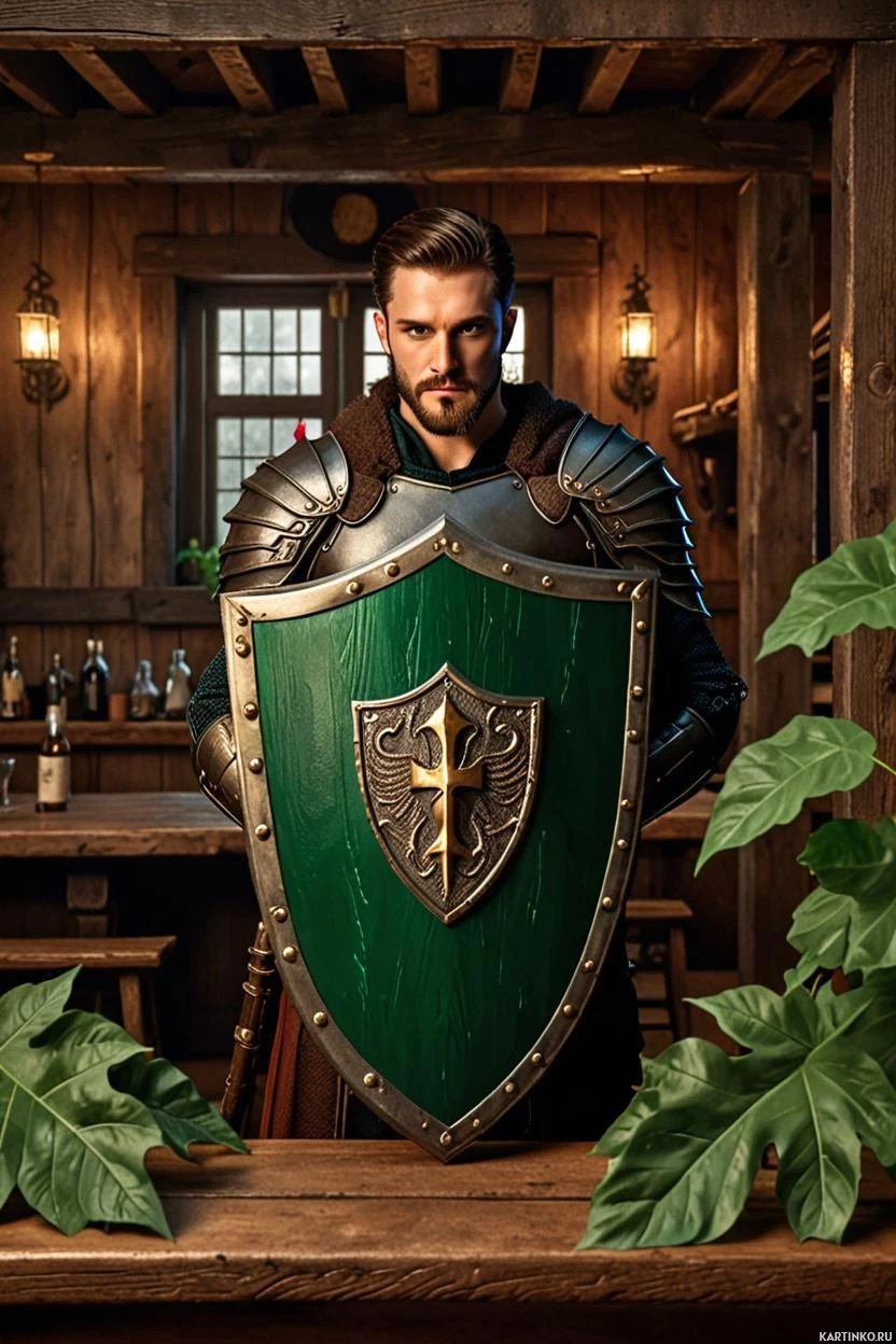 a medieval era. He is holding the breastplate up to display it. In the background, there's