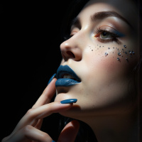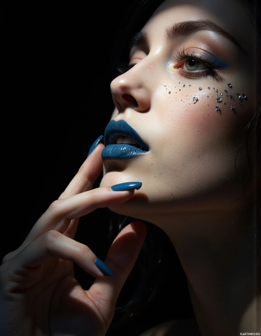 blue eyeshadow, accented with small silver dots that resemble stars or sparkles, adding an avant-garde touch to her appearance. She has a dramatic dark lip color which complements the rest of her