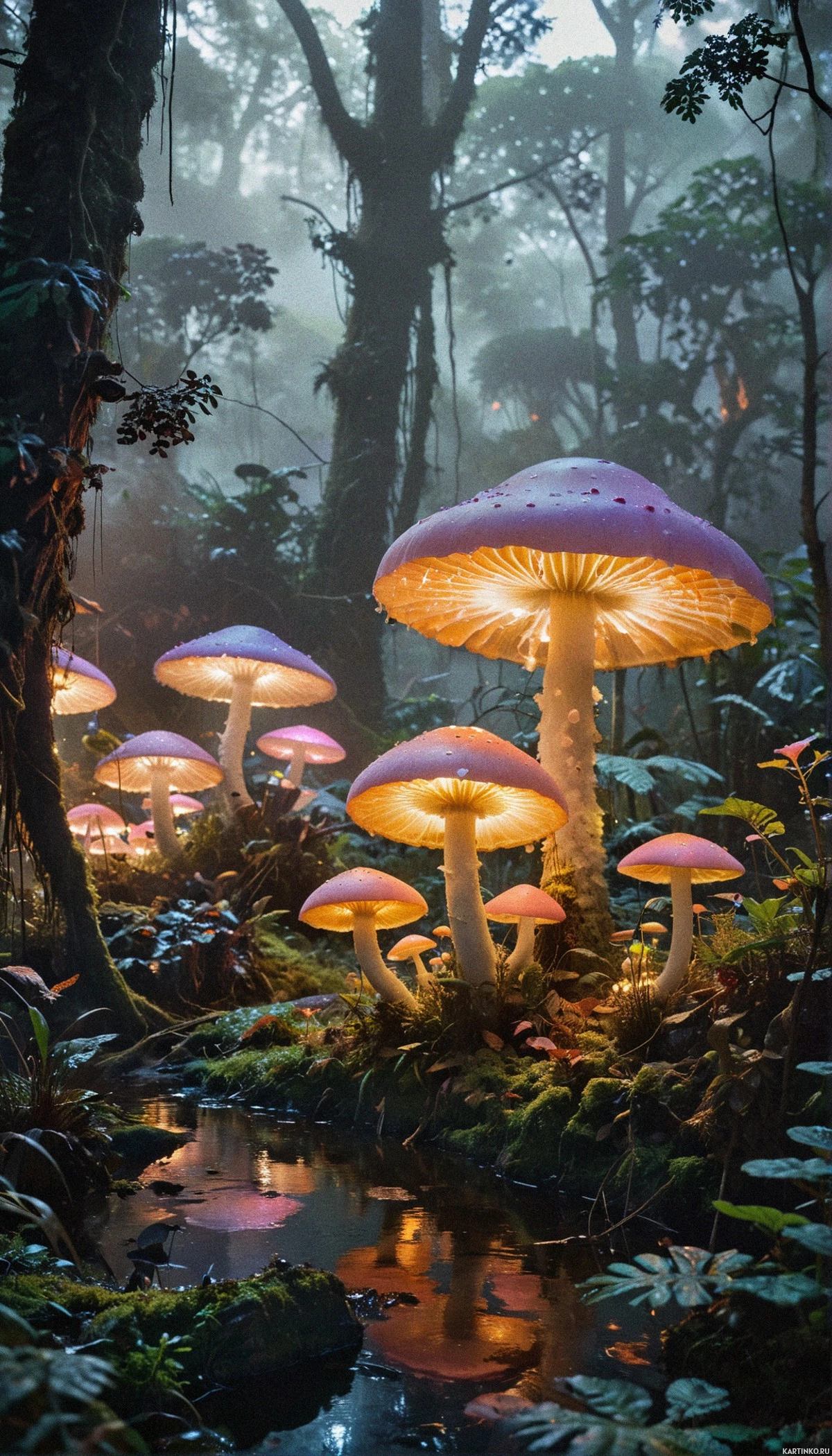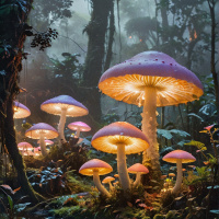 a glowing light at their base, giving them an ethereal appearance. The mushrooms vary in size and are surrounded by