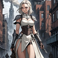 a sleeveless top and pants, with visible armor elements like thigh guards and a belt, suggesting she might have a role related to combat or adventure. She is holding what looks like a sword in her right hand, further indicating that she could be a character from an action-oriented game or story. The overall atmosphere of the image is fantastical yet grounded in a realistic depiction of
