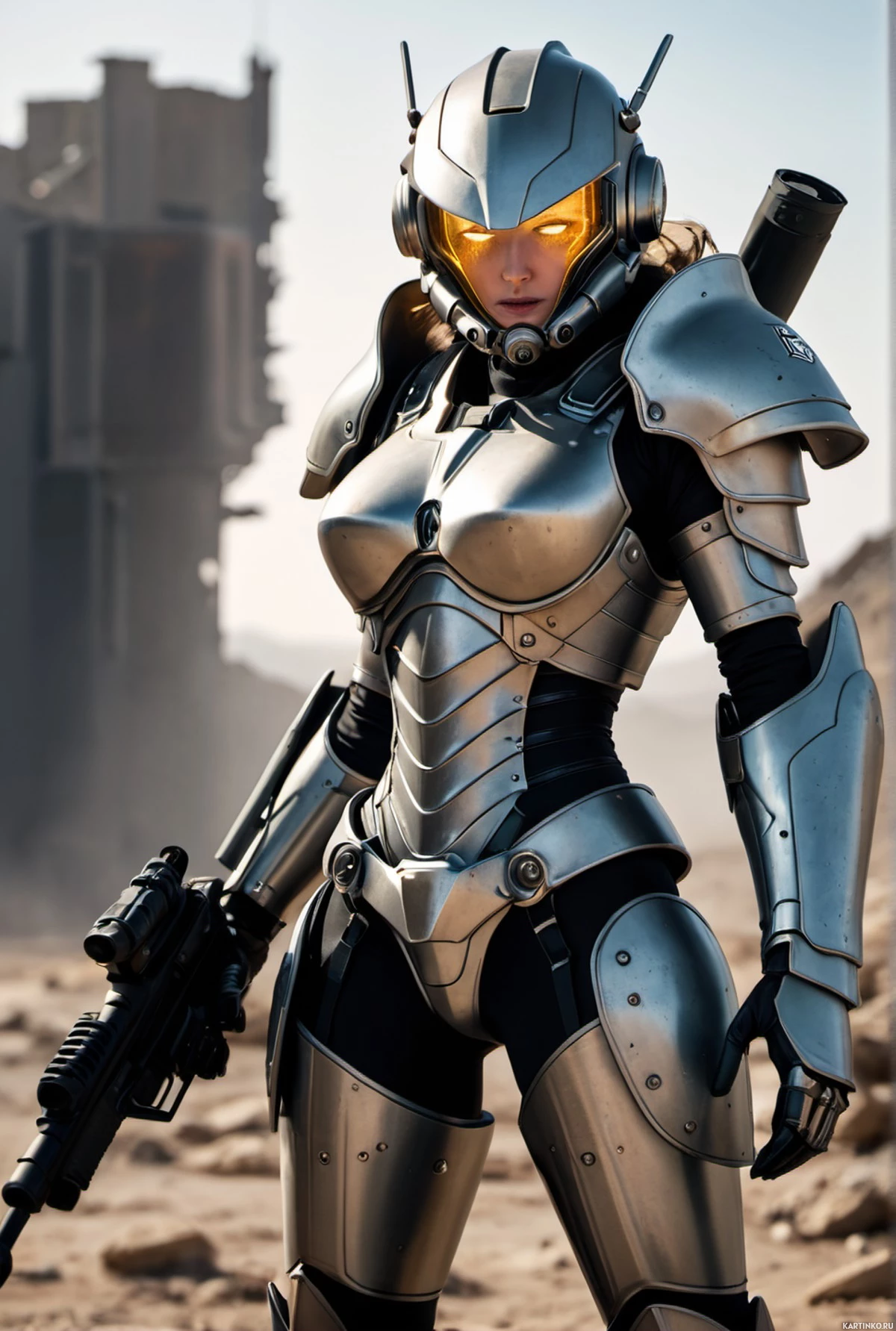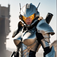 a female character wearing futuristic armor. She is equipped with a helmet and her attire includes body armor, giving her an appearance similar to that of soldiers from