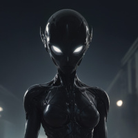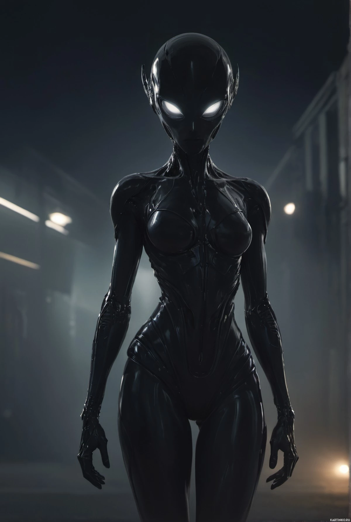 a science fiction setting. The expression on the character's face appears serious and somewhat menacing, further contributing to the character's otherworldly appearance. The background is dimly lit with streetlights casting shadows on the ground, enhancing the nocturnal atmosphere of the scene. There are signs of an urban environment like a building and possibly some text or markings on the wall that could provide additional context within a science fiction narrative. The overall aesthetic conveys a sense of mystery and otherworldly presence in a familiar human setting, which is typical of alien characters portrayed in science fiction genres.