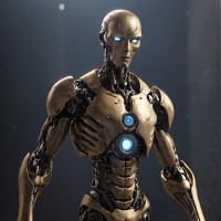 a power source or an interface for communication with humans. The robot's face is not visible in the image, focusing the viewer's attention on its torso and upper limbs. The lighting highlights the robot's