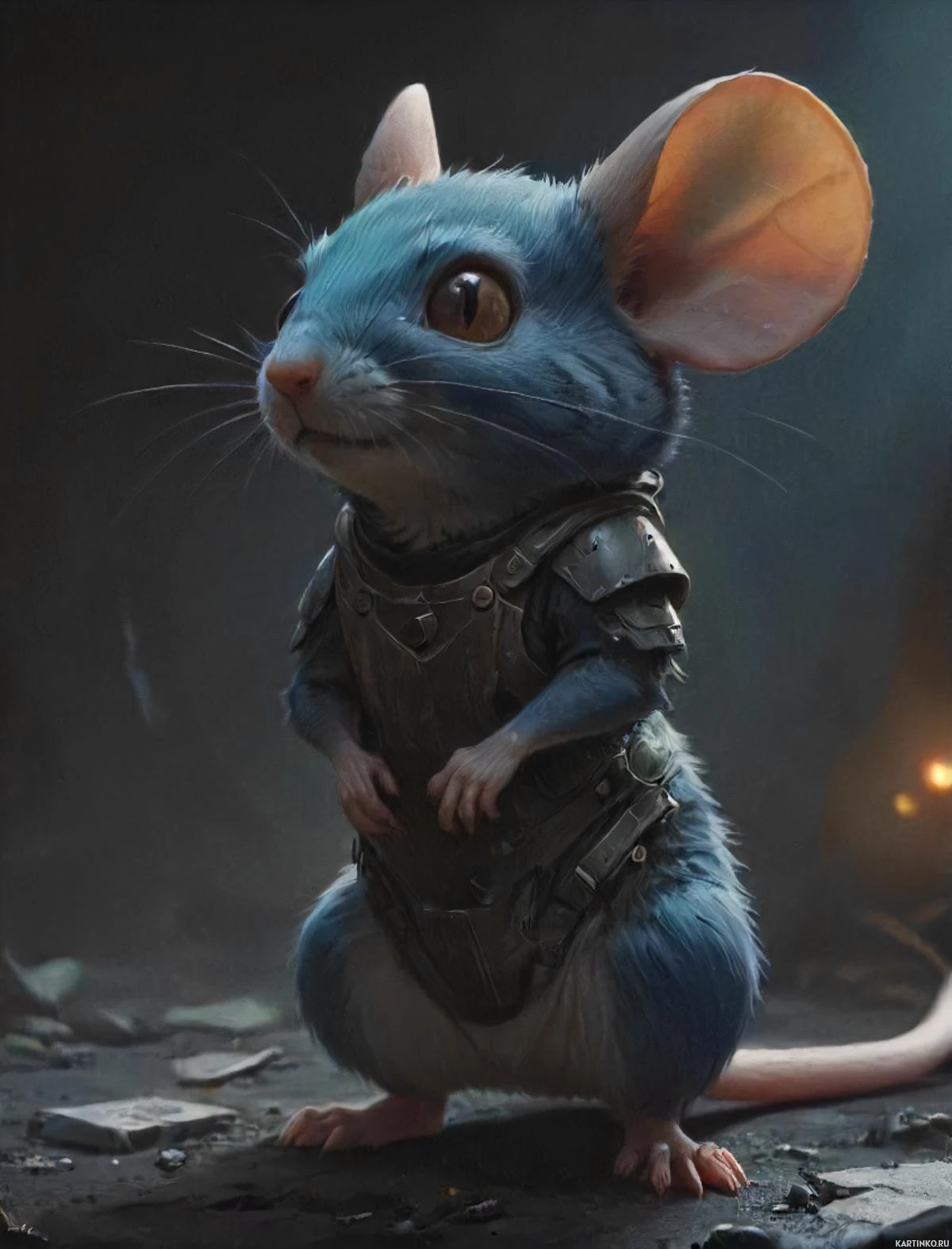 hind legs and wears a suit of armor that appears to be made from metal pieces shaped into a sleek, form-fitting design. The armor includes gloves and boots, and the mouse is also holding a sword with both hands as if it were ready for battle. The background consists of a dimly lit, textured environment that resembles a stone floor or pathway, suggesting