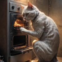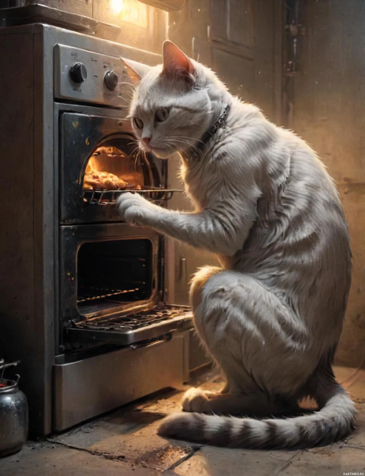 hind legs, seemingly trying to open an oven door. The oven has food inside it, visible through