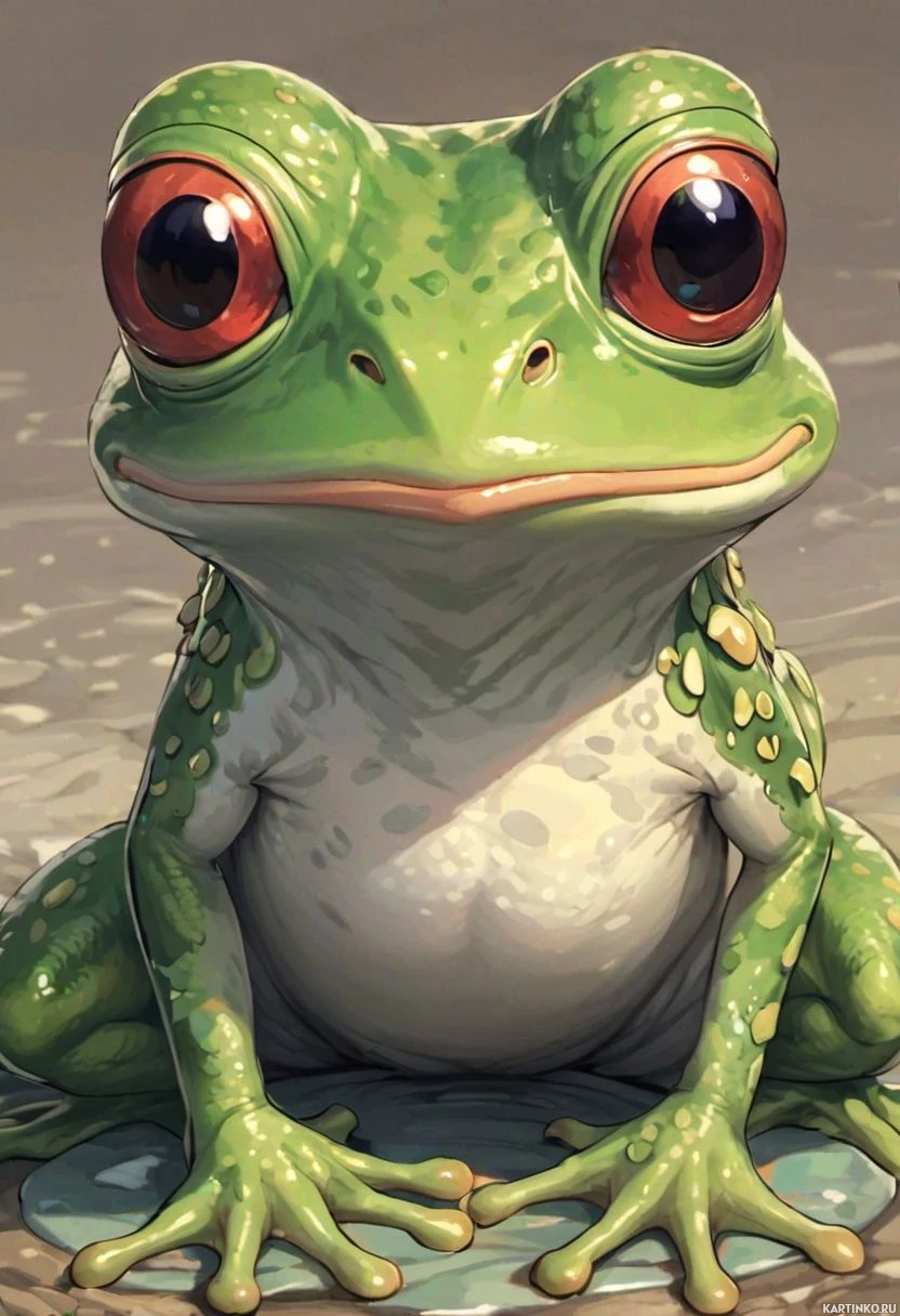 red eyes that seem to be glaring, and is sitting upright on its hind legs. It appears to be made of ceramic or a similar material, as suggested by the sheen and texture visible in the close-up shot. The frog is positioned centrally against a neutral background, which contrasts with its