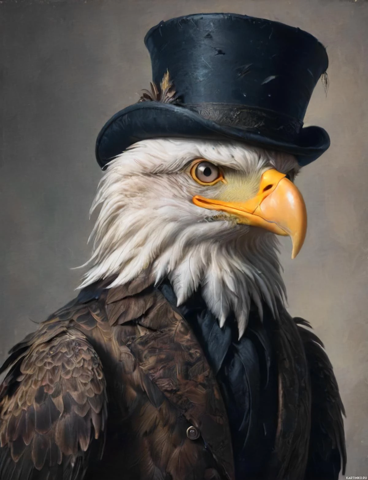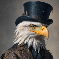 a top hat. The eagle is wearing a coat with tails and has its wings spread behind it. Its head is turned slightly to one side as it gazes directly at the viewer. The artwork showcases a blend of anthropomorphic characteristics with animal features, resulting in a whimsical yet striking portrayal.