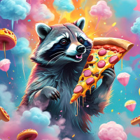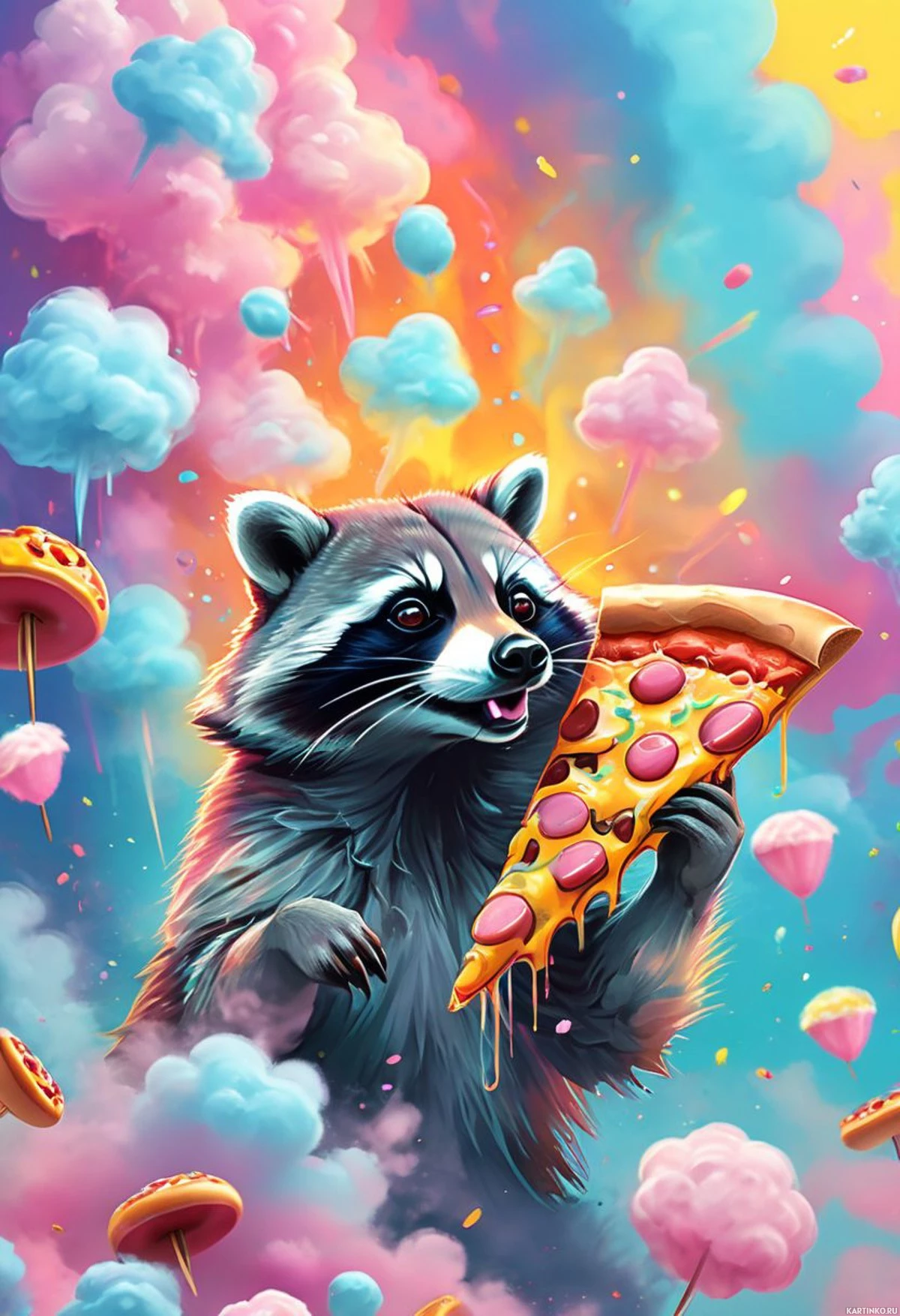 an animated raccoon, which is holding a slice of pizza in its paws. The raccoon appears to be in motion, as if it's running or dancing with delight. The background is vibrant with a multitude of colorful clouds that resemble rainbow-colored
