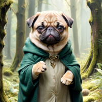 wooded area, where the pug is depicted standing amidst the trees, which are mossy and provide a naturalistic backdrop to the figure. The overall style of the image suggests a whimsical