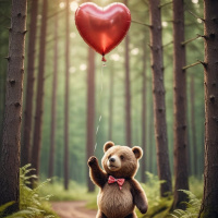 shaped balloon, which is floating slightly above his head. The overall color palette is soft and muted, with warm tones giving it