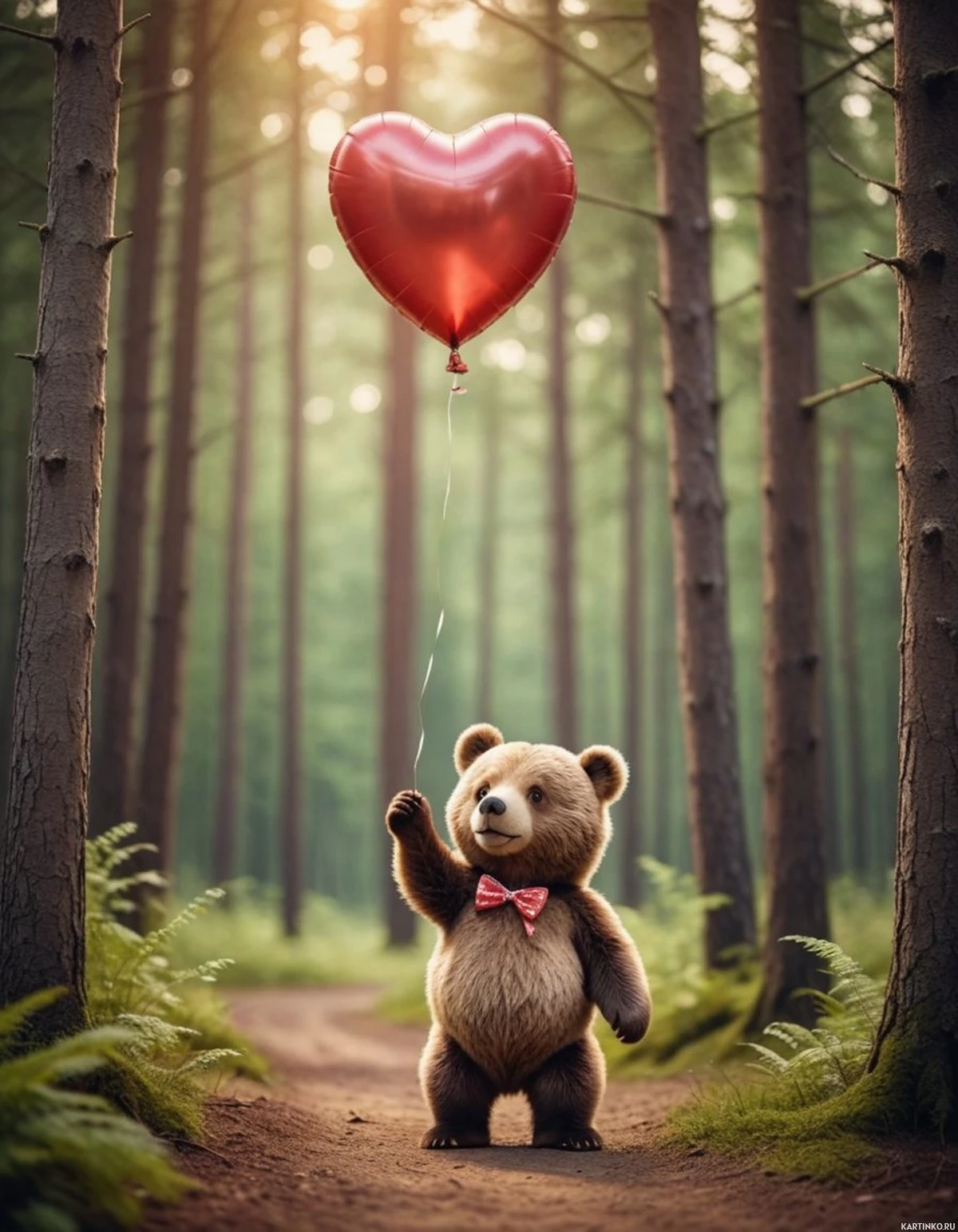 thin trees that create a tunnel-like effect down the path he is on. He holds up a heart-