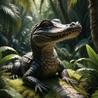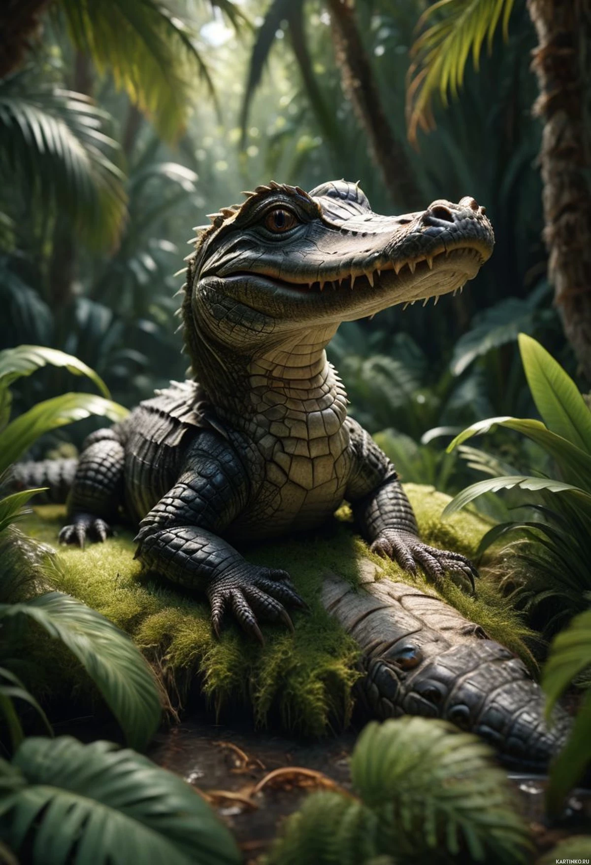 a patch of grass or moss, with its mouth open and eyes looking forward. It appears to be sitting or laying down. Surrounding the croc are various tropical plants, including