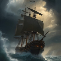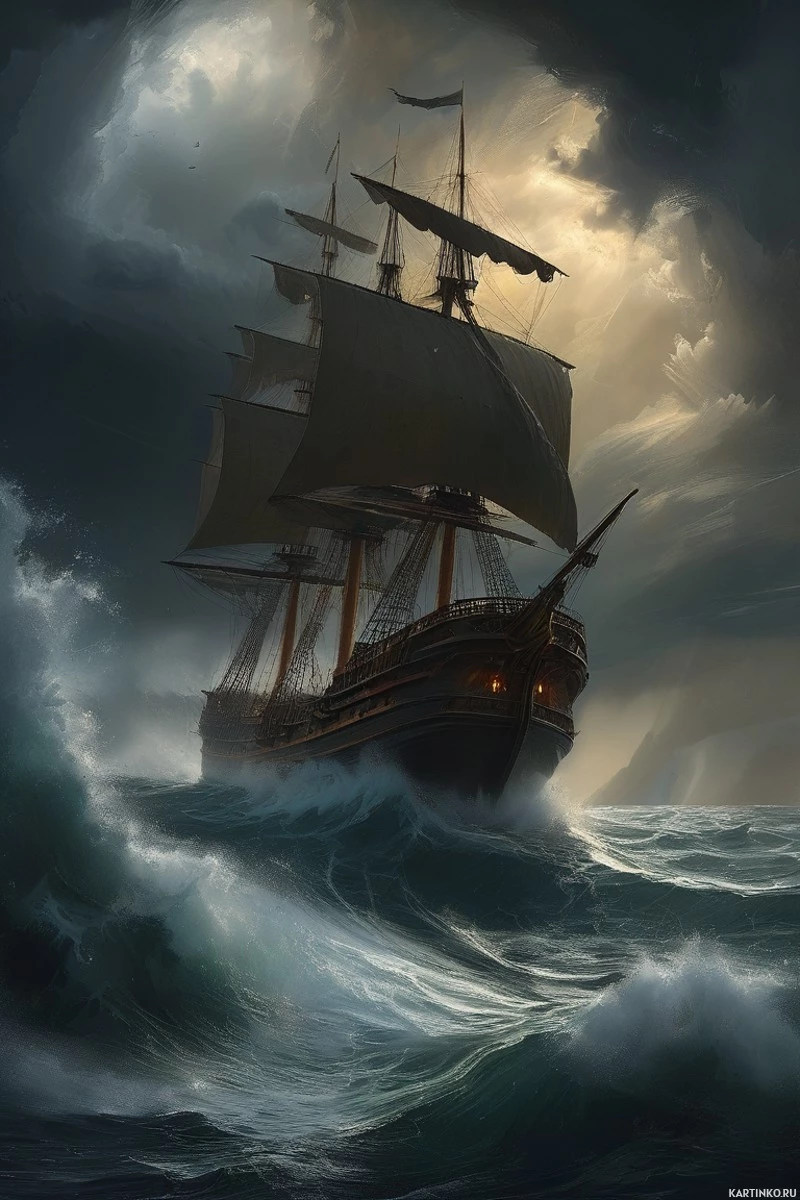 sailing ship amidst choppy waves. The ship, characterized by its