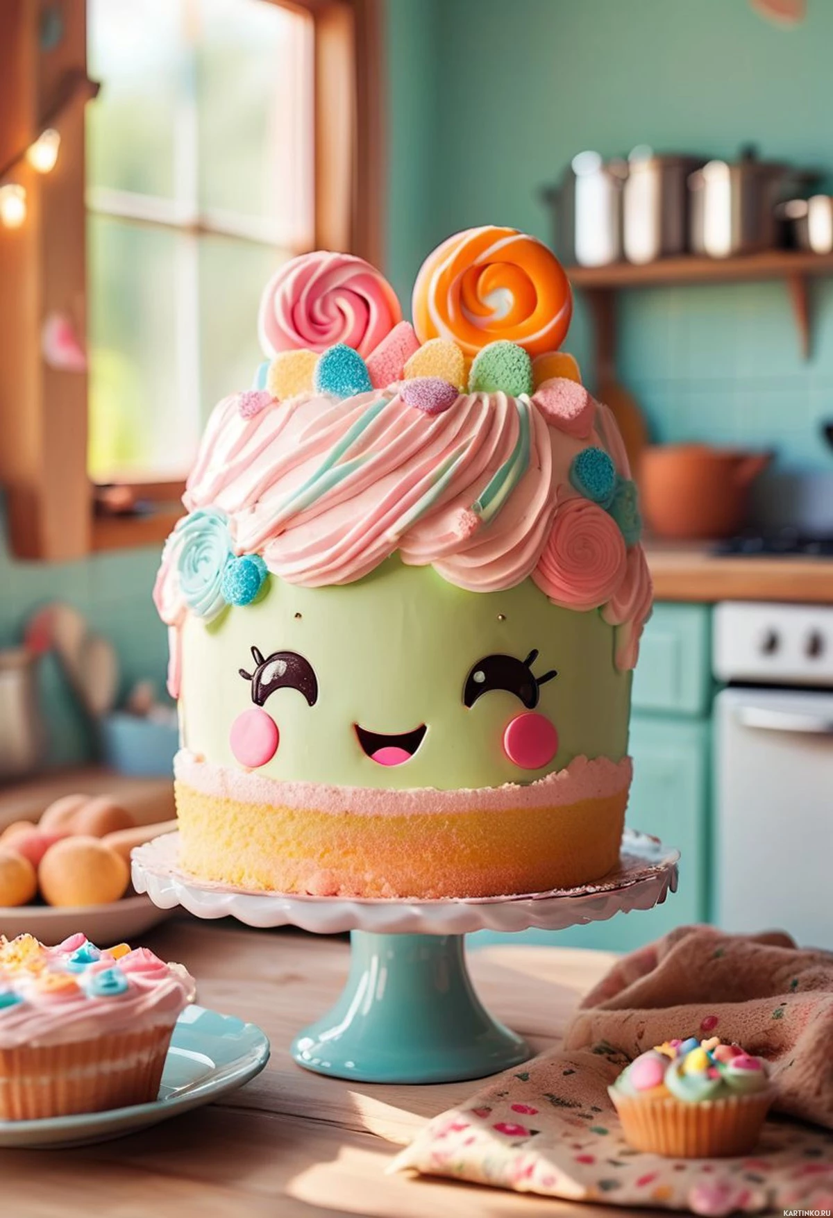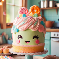 kitchen appliances and cabinets that suggest this setting might be a kitchen where the cake was prepared. The style of the image is bright and cheerful, emphasizing the festive and playful nature of the dessert.