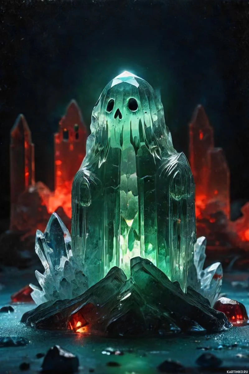 a fantasy scene with a large, central rock formation that features a carved skull on its peak. This formation is surrounded by smaller rocks and glowing crystals in hues of blue and red, which could be interpreted as magma or