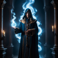 The image depicts a fantasy-themed scene featuring a character who appears to be a mage or wizard. This individual is dressed in elaborate robes with hoods and