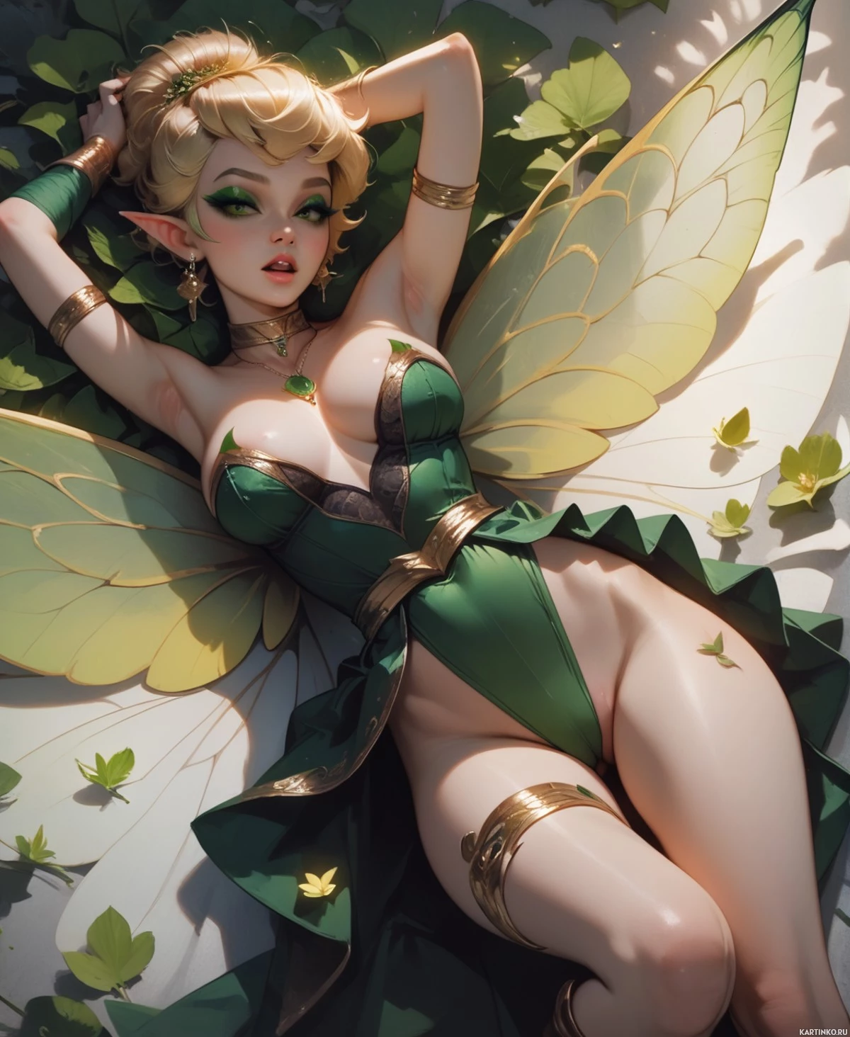 The image features a character who appears to be a fairy or fantasy creature. She has green skin, pointy ears, and large wings that are adorned with