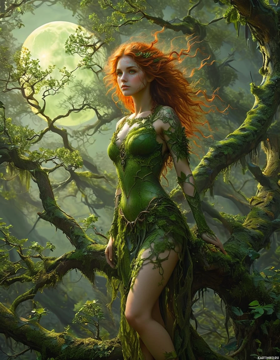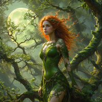 a tree branch in what appears to be a forest setting with a moon visible behind the trees. The overall atmosphere of the image evokes