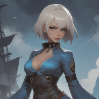 На картинке изображена женщина с белыми волосами. У неё серьёзное выражение лица, а на ней – синий плащ с золотой отделкой, чёрные брюки и сапоги. В правой руке она держит меч с серебряной рукоятью и красной накладкой, а на левом бедре у неё пистолет со сложной гравировкой. На заднем плане – корабль и чистое голубое небо.
