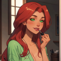 a slender build and is wearing makeup, including eyeliner and lipstick. Her hair is styled in
