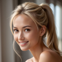 На картинке запечатлена молодая женщина, которая, судя по всему, является главным объектом. У неё светлые волосы, собранные в высокий пучок, на лице лёгкая улыбка, а взгляд направлен прямо в камеру. Фон размыт, что говорит об интерьере, возможно, комнате с естественным освещением слева.