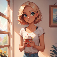 The image features a young woman with blonde hair seated by an open window. She is holding a drink in her hand, which appears to be a cup of coffee or hot chocolate. Her attire consists of denim shorts and a sleeveless top. Behind her on the windowsill are two potted plants. The room has a cozy interior decor with framed pictures on the wall. The lighting suggests it's daytime, possibly early morning or afternoon given the soft shadows on the walls.