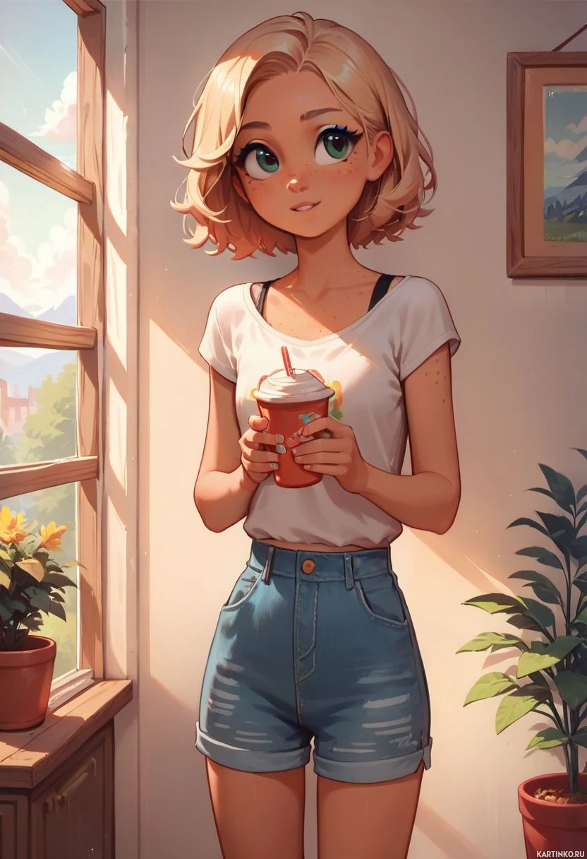 На картинке изображена молодая женщина с светлыми волосами, сидящая у открытого окна. В руке она держит напиток, похоже, кофе или горячий шоколад. На ней джинсовые шорты и майка. На подоконнике за её спиной стоят два горшка с растениями. Комната оформлена в уютном стиле, на стенах висят рамки с фотографиями. Освещение указывает на дневное время, возможно, раннее утро или полдень, судя по мягким теням на стенах.