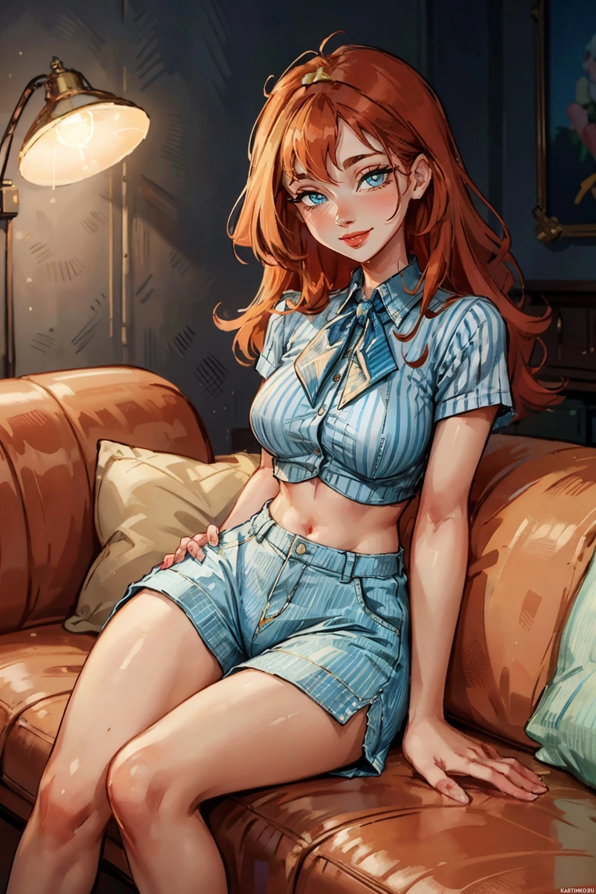 a female character with red hair seated on a couch. She has a casual appearance, wearing