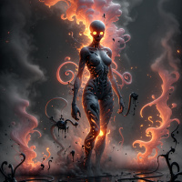 This image depicts a figure that appears to be standing amidst chaos and destruction. The character has a robotic, metallic body with glowing red eyes and is wearing armor-like clothing. Surrounding the character is smoke, debris, and what seem to be flames or fiery tendrils that emanate from the top of their head, suggesting an intense, possibly destructive power or energy. The background is dark with dramatic clouds and more fire-like elements, which contribute to a sense of chaos or apocalyptic scene. The style of the image suggests it could be concept art for a video game, movie, or other media, designed to convey a strong narrative impact through visual storytelling.