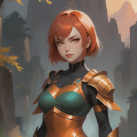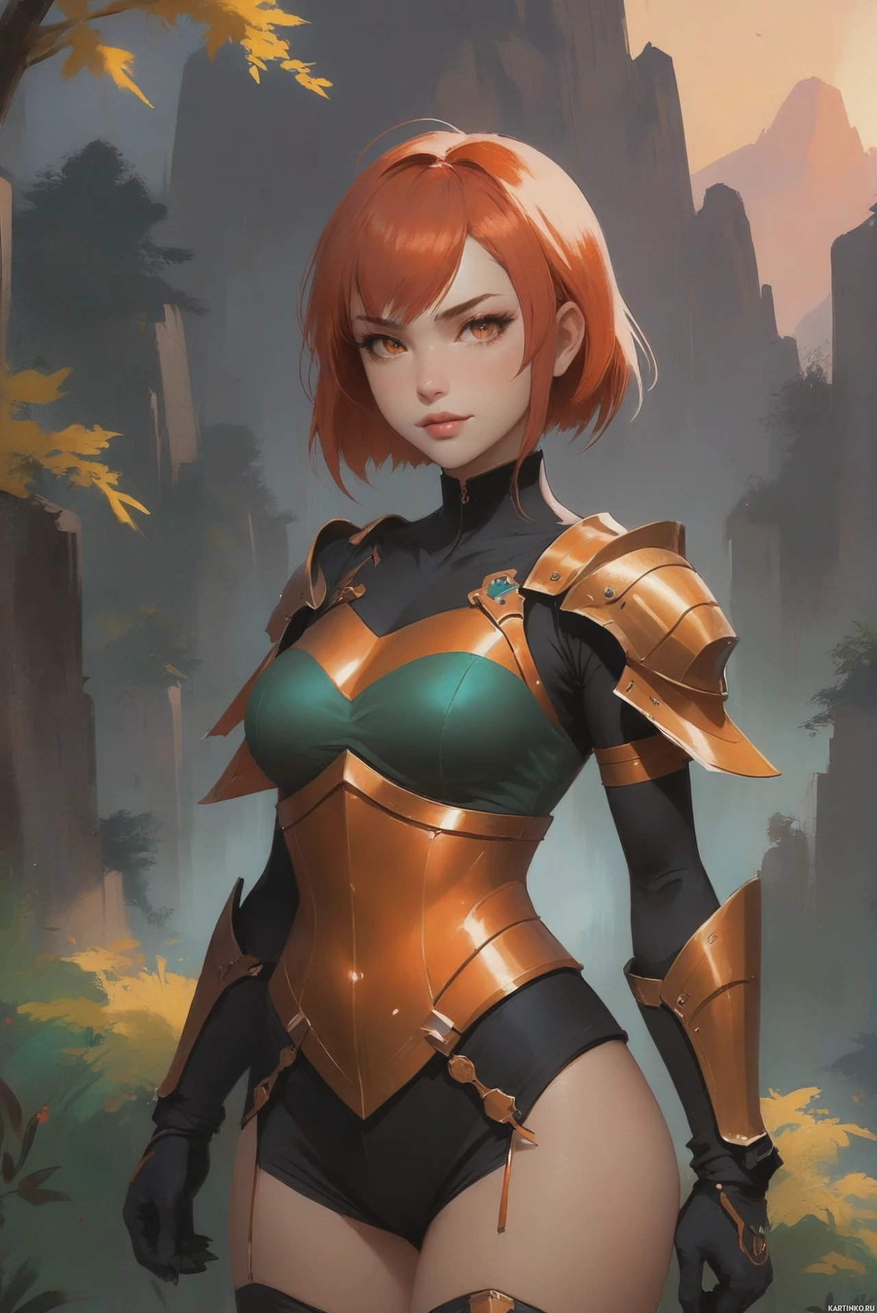 На картинке изображена девушка с рыжими волосами в доспехах, стоящая на фоне природы, освещенной мягким светом, напоминающим рассвет или закат. На её лице – серьёзное выражение. На заднем плане видны деревья и скалы, что указывает на лесистую или горную местность.