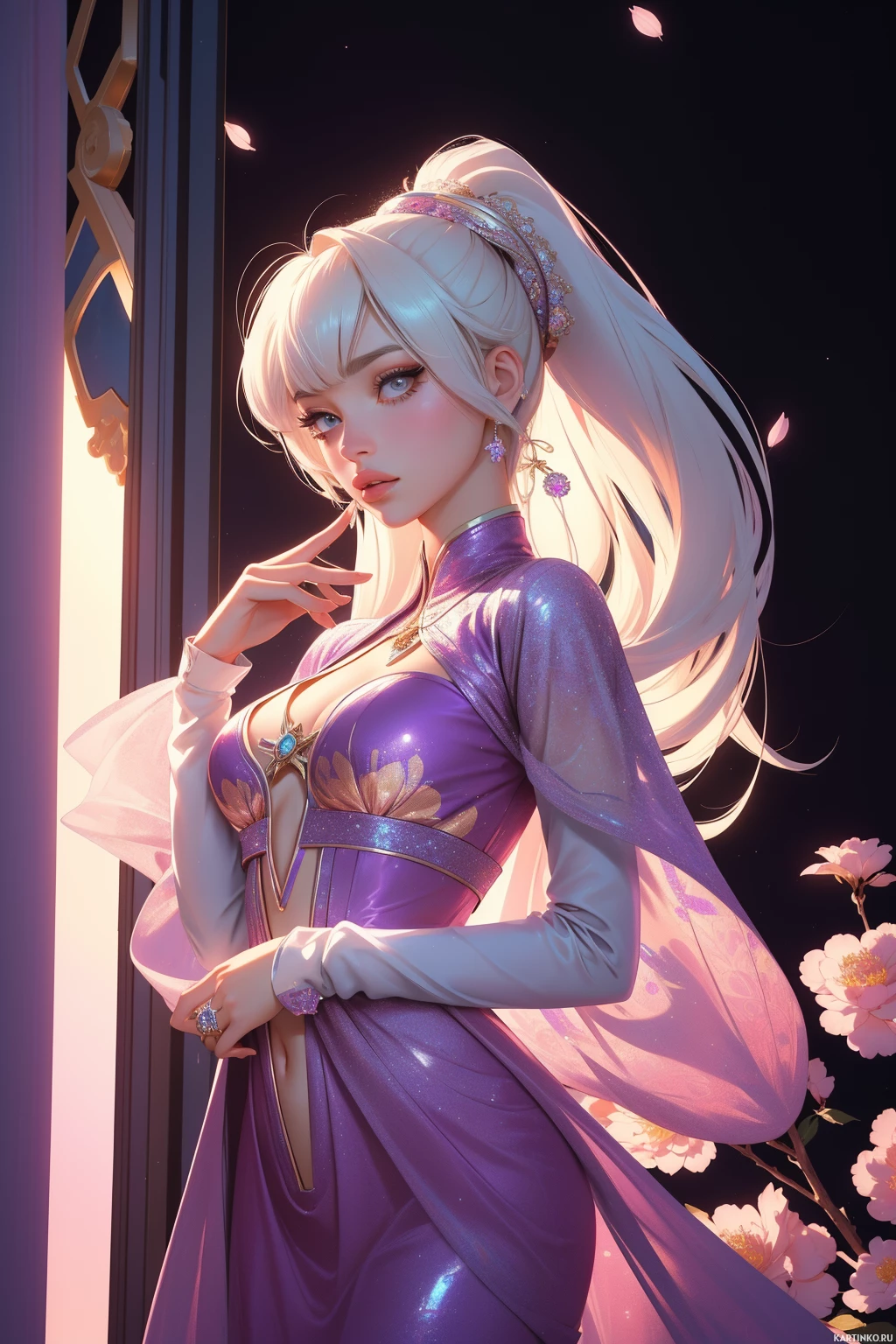 a purple dress that appears to have intricate detailing and jewelry, including an amulet around her neck. Behind her, there's a door or window frame that seems to be illuminated by soft light, casting