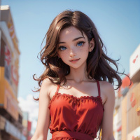 a small handbag over her left shoulder. The setting suggests a bright day with clear skies, as indicated by the shadows cast on the ground and buildings around her. The buildings have colorful signs and advertisements, which is characteristic of commercial streets in many cities. There are other pedestrians visible in the background, indicating that this street is likely a popular shopping or dining area.