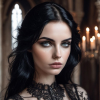 an elaborate costume that could be considered historical or fantasy-inspired. The woman has long dark hair and striking