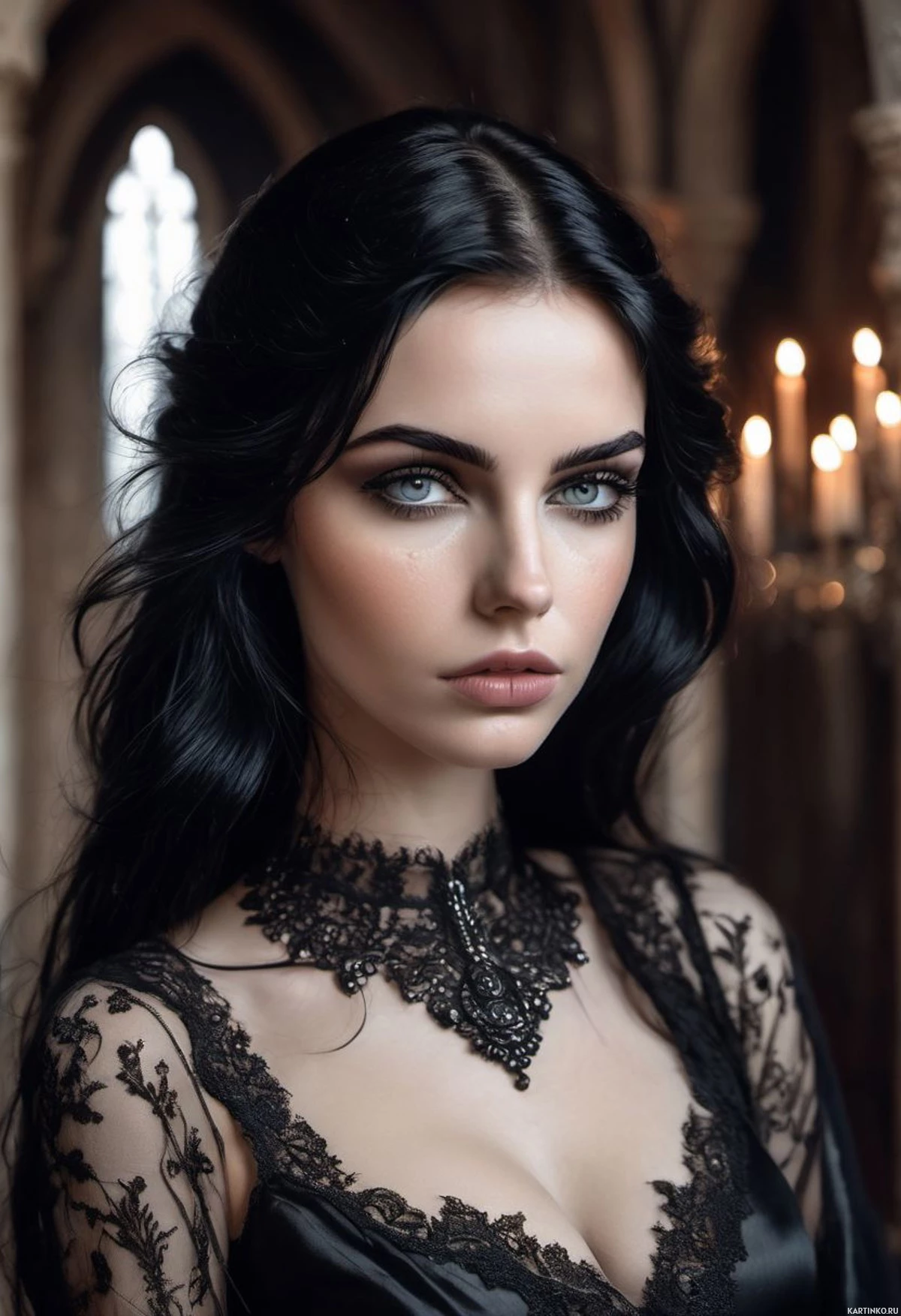 a serious expression on her face and is looking directly at the camera. Her attire includes what appears to be a black lace dress with