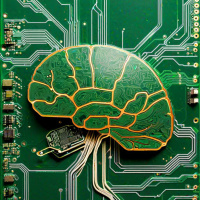 circuit board. The brain is rendered in
