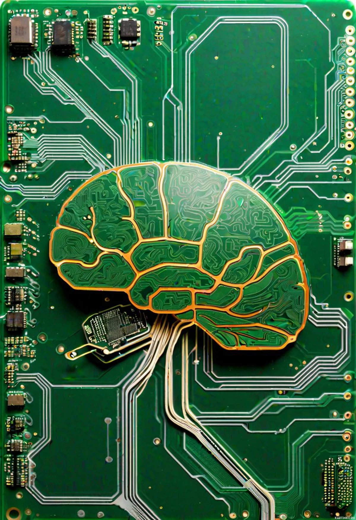 shades of green and yellow, representing its gyri and sulci, with prominent blood vessels visible on the surface. The circuit board has various