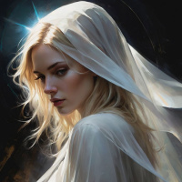 a young woman with long blonde hair. She appears to be wearing a flowing, old-fashioned garment that could be interpreted as a robe or a costume inspired by