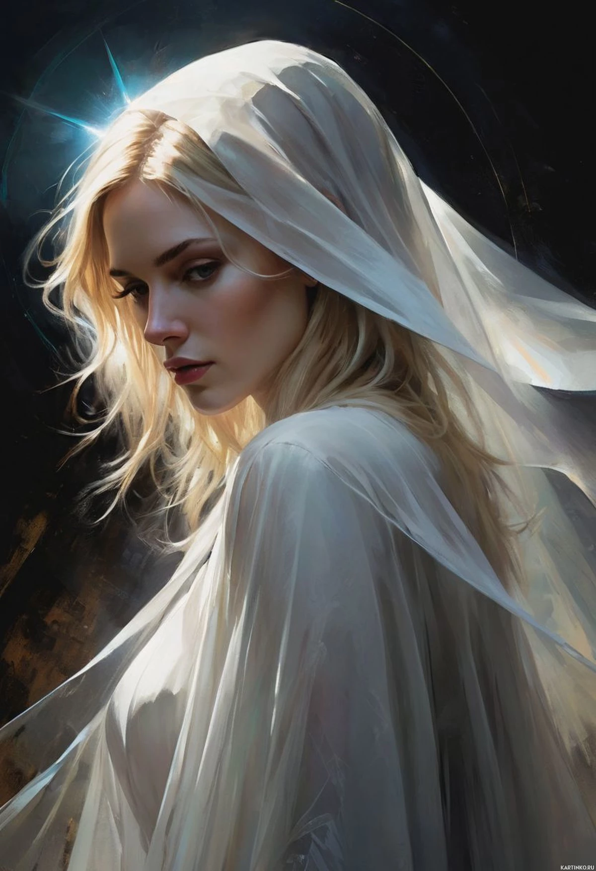 soft lighting that highlights her features and the texture of her garment.
