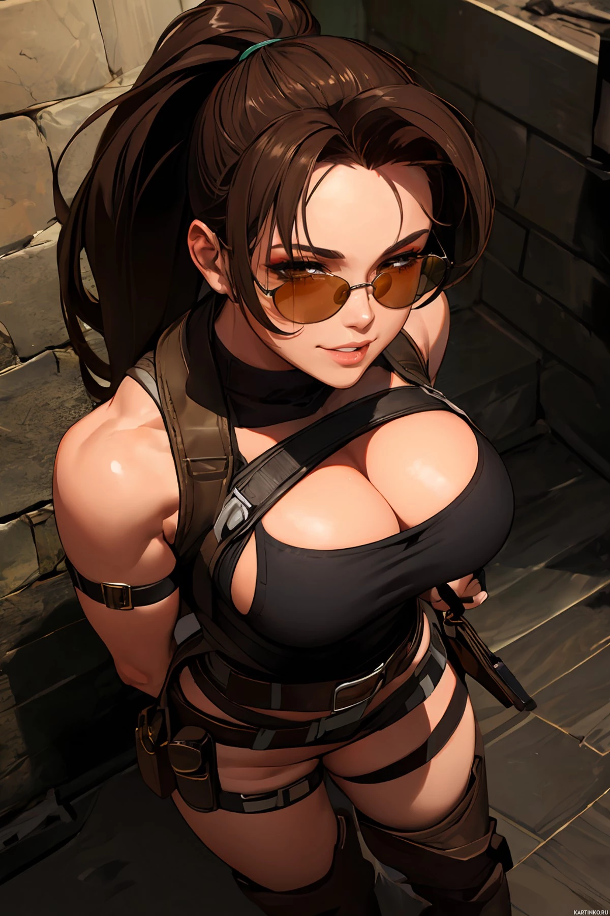 female character, who appears to be designed in an anime or video game art style. She is wearing sunglasses and has short hair with some highlights of red that could suggest she's part of