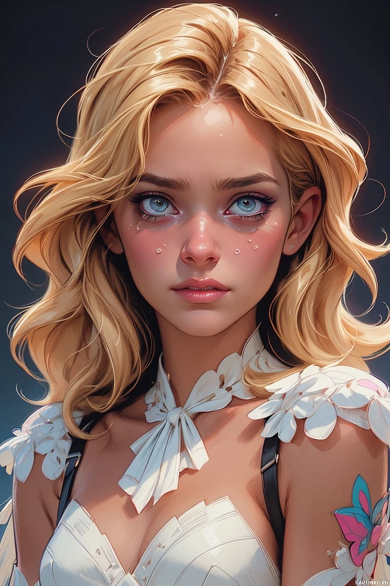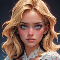 a young woman with blonde hair and striking blue eyes. She is wearing an outfit that appears to be a fantasy-inspired attire, possibly a costume or