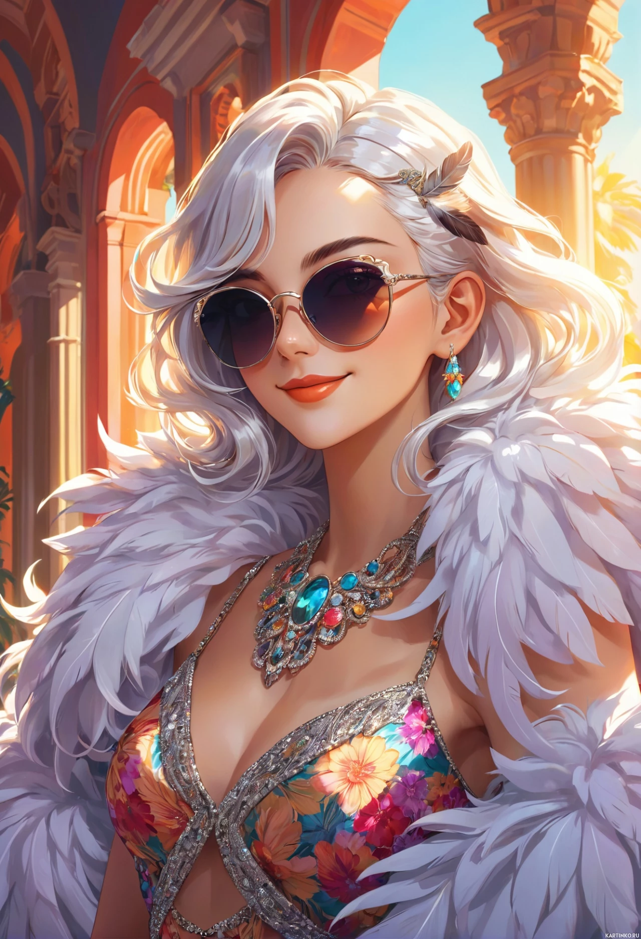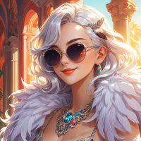 white hair. She is wearing sunglasses and has