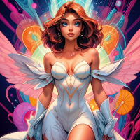 red hair. She has wings on her back and is wearing what appears to be angelic or superhero-style attire, including