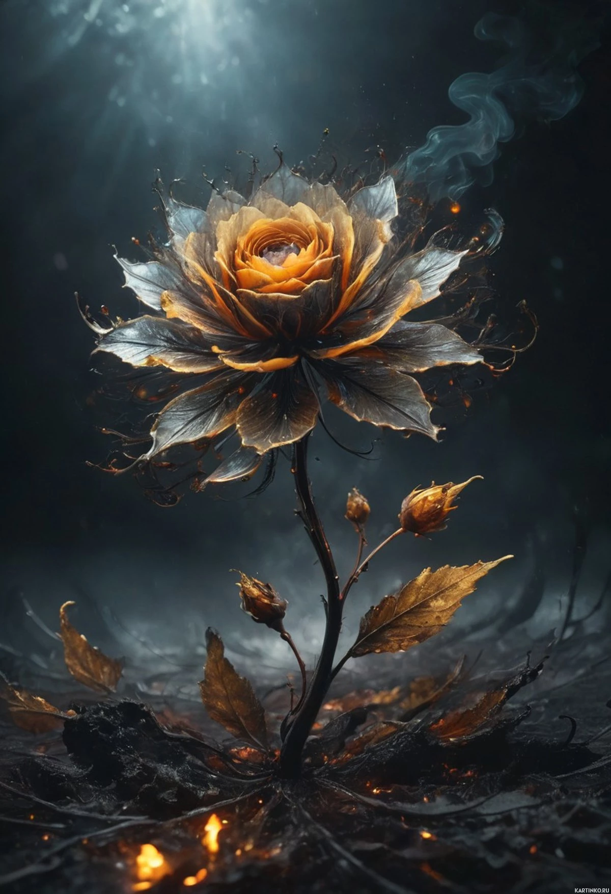 Lightning bolts can be seen in the upper part of the image, adding to the dramatic and perhaps tumultuous atmosphere. Below the flower, there is a cracked and jagged surface that contrasts with