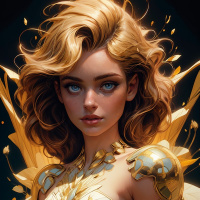 an elaborate costume or armor that includes a chest piece with a design resembling scales or feathers, suggesting a fantasy or mythical theme. There is also a section on her neck that appears to be adorned with some sort of gemstone or embellishment, possibly indicating status or power within the context of the character's story. The artwork is rich in detail and color, using a palette that includes golden tones which contrast well with the cooler tones of her skin and hair. The overall effect is one of luxury and mystique.